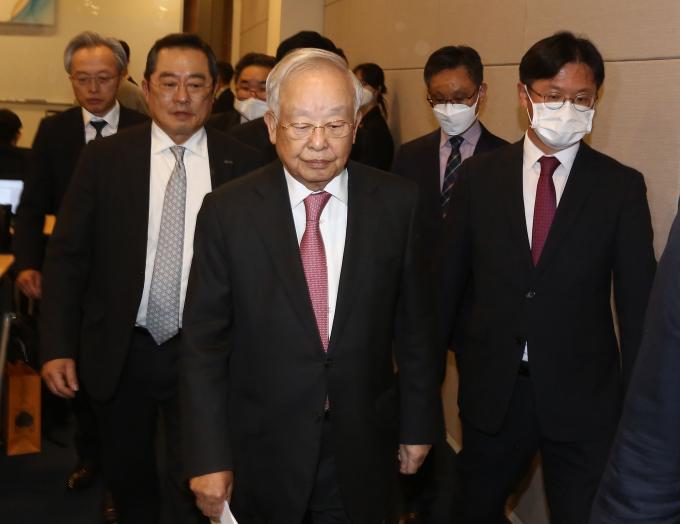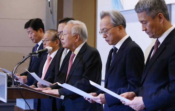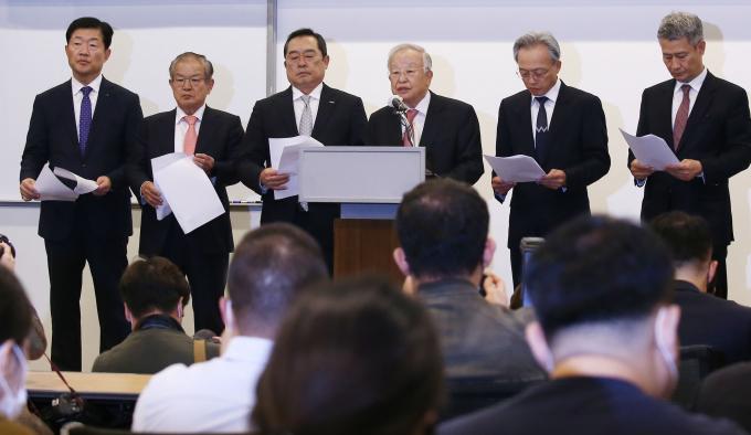 손경식 한국경영자총협회 회장이 24일 오후 서울 중구 대한상공회의소에서 열린 경제위기 극복을 위한 경제 6단체 긴급 기자회견에서 공동성명을 발표하고 있다. 왼쪽부터 우태희 대한상공회의소 상근부회장, 권태신 전국경제인연합회 상근부회장, 구자열 한국무역협회 회장, 손경식 경총 회장, 최진식 한국중견기업연합회 회장, 이재원 중기중앙회 전무.
