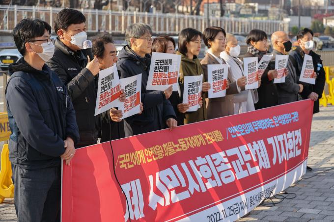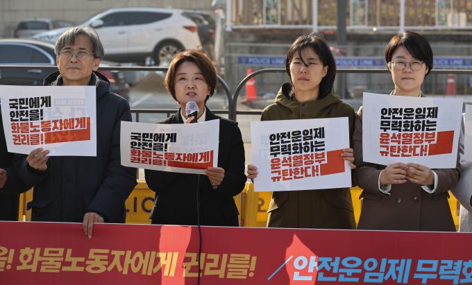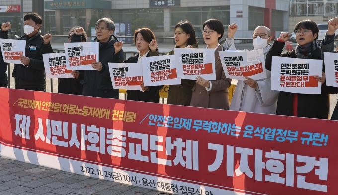 화물연대 파업을 지지하는 시민사회종교단체가 25일 오전 서울 용산 대통령 집무실 앞에서 기자회견을 열고 있다. 이날 참여 단체들은 "화물안전운임제는 국민의 도로안전을 지키는 제도이자 화물노동자의 인간다운 삶을 보장하는 제도임이 지난 3년의 시행을 통해 이미 나타났다"면서 안전운임제 확대를 촉구했다.