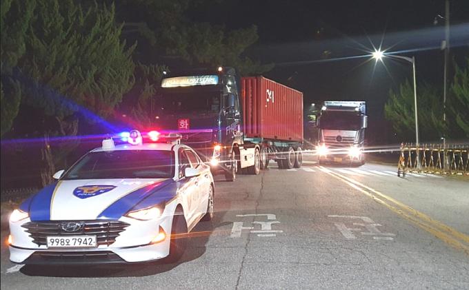 경찰은 25일 밤 화물연대 조합원의 불법 행위로 불안을 느낀 트레일러 운전기사의 요청으로 남구 감만부두~용당파출소 구간에서 에스코트를 처음 실시했다.