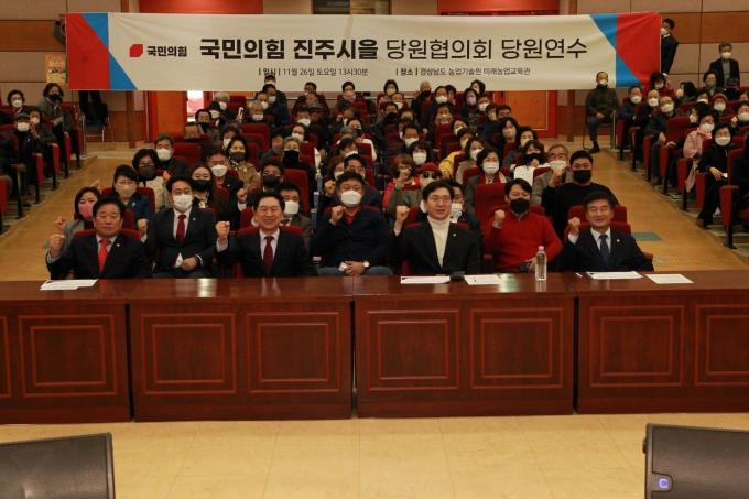 당원 연수에는 김진부 경남도의회 의장, 최신용 진주시의회 부의장 등 당원 500여 명이 참석했다.