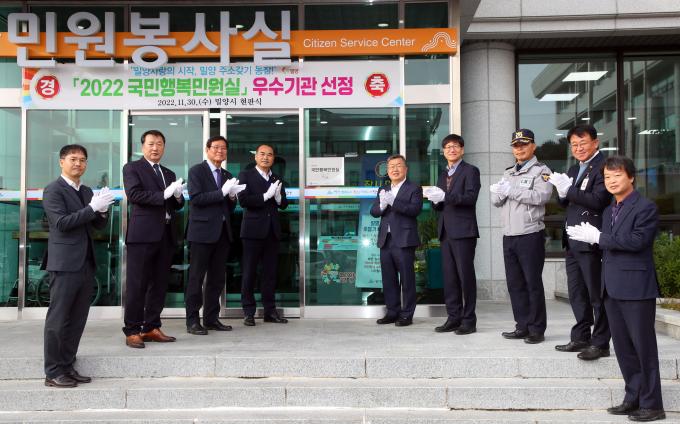 '국민행복민원실'은 행정안전부가 민원실을 갖춘 지방자치단체와 전국 공공기관을 대상으로 민원실 내·외부 공간, 민원서비스 등을 심사 평가해 우수기관을 선정하는 포상제도다. 올해 첫 인증 기관으로 선정된 밀양시는 2025년까지 우수기관 지위를 유지한다.