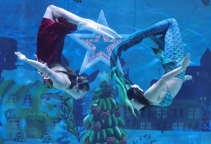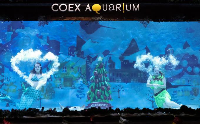 다가오는 크리스마스를 맞이해 코엑스아쿠아리움이 1일 오전 미디어데이를 열고 크리스마스 특집 수중 공연을 선보이고 있다. 인어공주와 크리스마스 요정이 수중 크리스마스트리 주변에서 물방울 하트를 그리는 퍼포먼스를 펼치는 등의 특집 공연은 12월 말까지 월요일 제외 주중 3회, 주말 5회 선보인다.