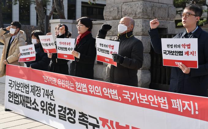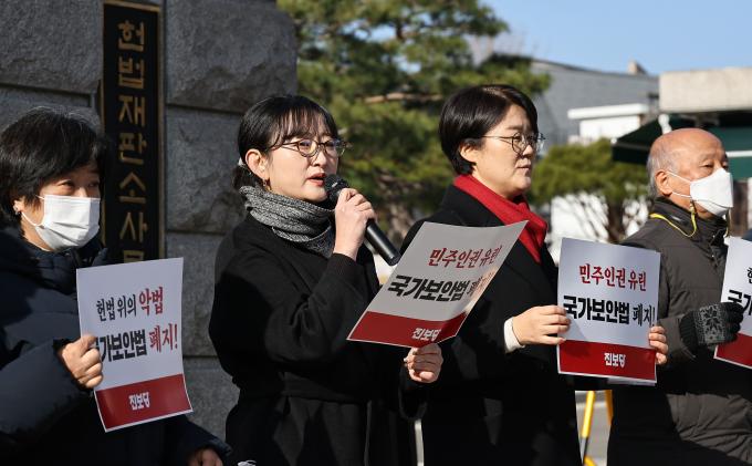 국가보안법 제정 74년을 맞이한 1일 오전 진보당 윤희숙 상임대표가 서울 종로구 헌법재판소 앞에서 국가보안법 위헌 결정을 촉구하는 기자회견을 열었다.