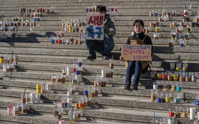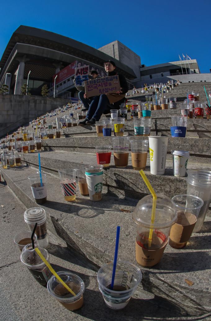 1회용컵 보증금제가 세종과 제주지역에서 처음으로 시행된 2일 오전 녹색연합, 여성환경연대, 환경운동연합, 이제석 광고연구소가 서울 종로구 세종문화회관 계단에서 정크아트 퍼포먼스를 진행했다.'1회용컵 보증금제의 전국 시행'을 요구하는 이날 퍼포먼스는 쓰레기로 버려진 일회용컵으로 플라스틱 오염 문제 해결을 촉구하는 시민들의 메시지를 담았다. 참가자들은 전 세계적으로 플라스틱 생산량과 폐기물 발생량이 지속적으로 증가하고 있고 기후위기와 같은 환경문제에 영향을 미치고 있어 플라스틱 문제 해결에 정부가 적극적으로 나서줄 것을 촉구했다.