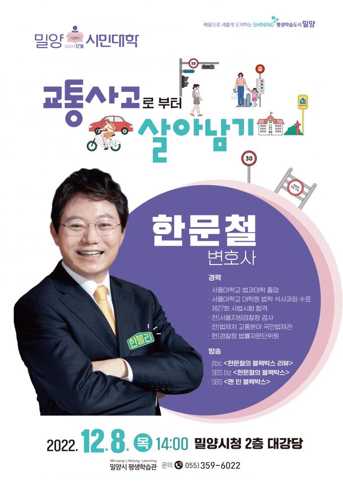 교통사고 예방과 교통안전문화 확산을 위해 12월 강연자로 교통사고 전문가 한문철 변호사를 초청했다.