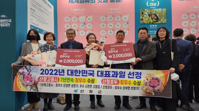 산청군은 2일 대구 엑스코에서 열린 '2022 대한민국 대표과일 선발대회'에서 성현기(71·단성면) 씨가 출품한 고종시와 민병기(70·오부면) 씨가 출품한 호두가 농림축산식품부장관상(최우수상)을 수상했다고 밝혔다.