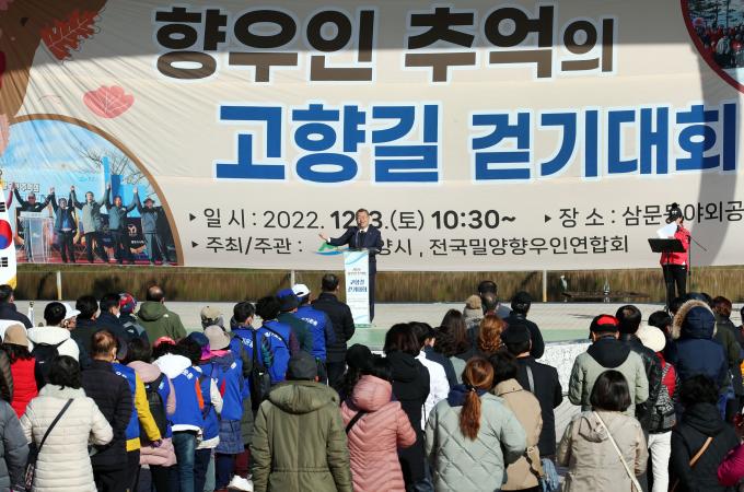 3년 만에 재개된 이번 걷기대회에서 향우인들은 영남루둘레길과 읍성성곽을 걸으며 나날이 변화하는 고향의 발전상을 느끼는 초겨울 정취를 만끽했다.