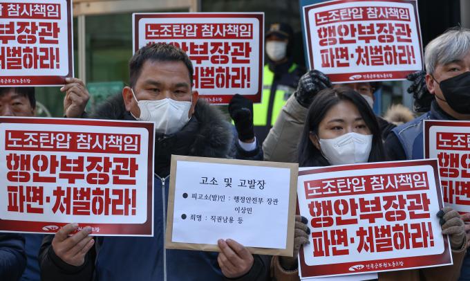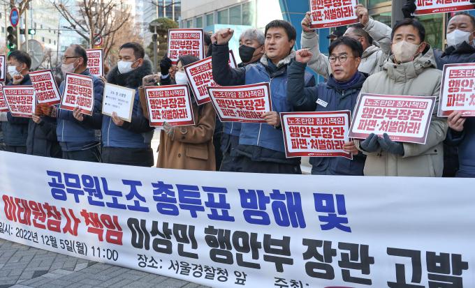 전공노 전호일 위원장은 "이상민 장관을 직권 남용, 업무방해, 직무유기, 업무상과실치사상죄로 경찰에 고발한다"고 밝혔다. 전 위원장은 "공무원 노조가 정부 정책에 대하여 조합원들의 의견을 묻는 총투표를 공권력을 동원해 집요하게 방해하고, 일방적이고 자의적인 잣대로 투표 참여자들에 대한 징계를 강요하고 있다"며 "이는 노동조합의 정상적인 활동을 심각하게 방해한 업무방해다. 이상민 장관을 즉각 파면하고 처벌하라"고 주장했다.