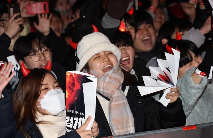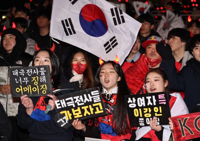 새벽 맹추위 속에서도 응원 열기만큼은 뜨거웠다. 카타르 월드컵 16강 한국·브라질전이 펼쳐진 6일 새벽 서울 광화문 광장에서 '붉은악마' 등 시민들이 응원전을 펼치고 있다.