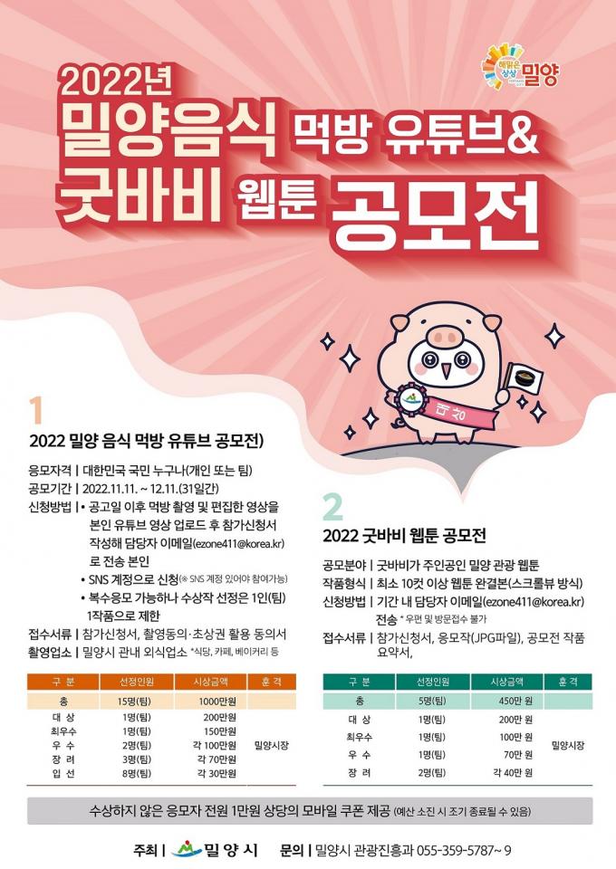 굿바비 웹툰 공모전에서는 돼지국밥캐릭터 '굿바비'를 주인공으로 해 밀양 먹거리, 생활상, 문화관광, 축제 등 밀양을 알릴 수 있는 모든 테마를 주제로 한 밀양 관광 웹툰을 제작·제출하면 된다. 총 5팀을 선정해 총 450만 원의 상금을 지급한다.