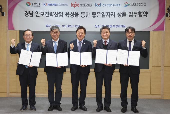 경남도는 6일 중소벤처기업진흥공단과 한국생산성본부, 한국산업기술시험원, 경남테크노파크와 함께 '경남 안보전략산업 육성을 통한 좋은 일자리 창출 업무협약'을 체결했다.