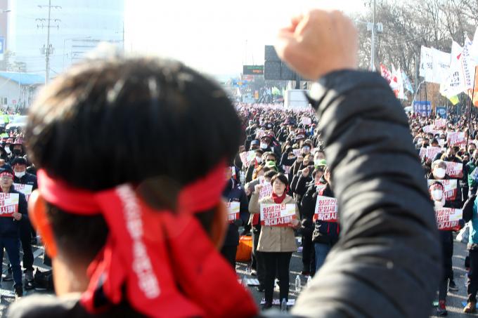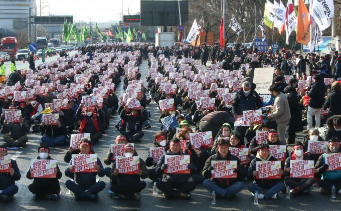 전국민주노동조합총연맹(민주노총)이 6일 오후 의왕시 내륙컨테이너기지(ICD) WP2터미널 앞 도로에서 전국동시다발 총파업 총력투쟁대회를 열고 있다. 화물연대, 건설노조, 서비스연맹 등 소속 조합원 3500여 명이 참가했다.