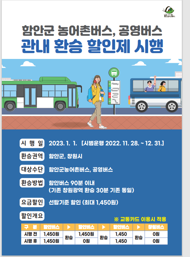 군은 2021년 창원시와 함안군을 오가는 주민들의 숙원사업인 광역환승할인제를 도입한 이후 대중교통을 이용하는 주민들의 편의를 위해 연이어 관내 환승할인시스템을 개발했다.
