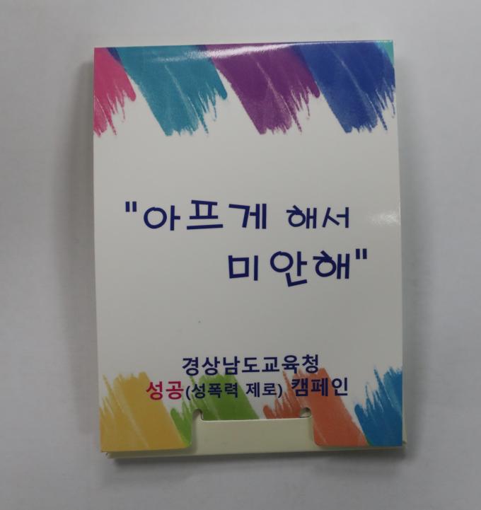 의료용 밴드를 넣은 수첩식 홍보물은 성폭력 금지 유형을 홍보하는 방식에서 벗어나 어떤 회복 지원 사업이 있는지를 안내하는데 초점을 두고 제작됐다. 속지에는 '피해 회복 중심 대화-사과하기' 예시문을 담았다.