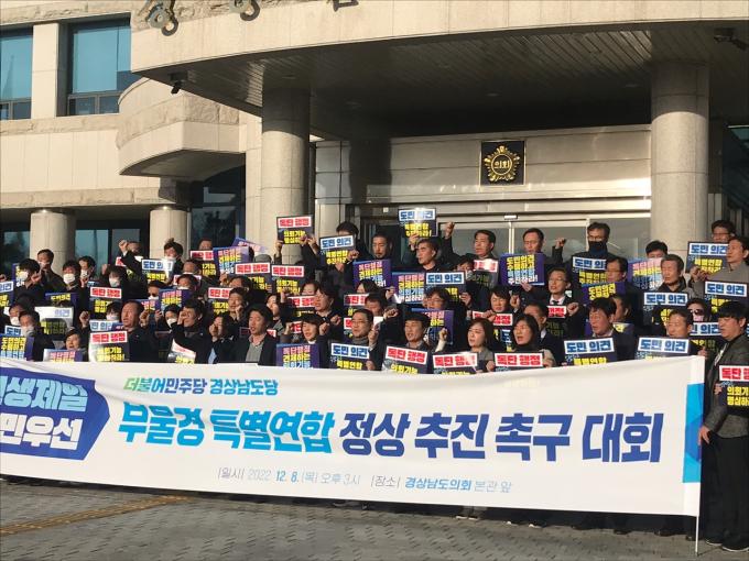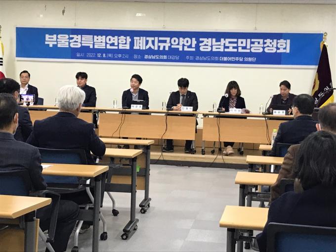 한편 공청회가 끝난 뒤 민주당 소속 전직 지방자치단체장과 전·현직 지방의원 등은 경남도의회 앞에서 부울경 특별연합 정상추진 촉구대회를 열었다.