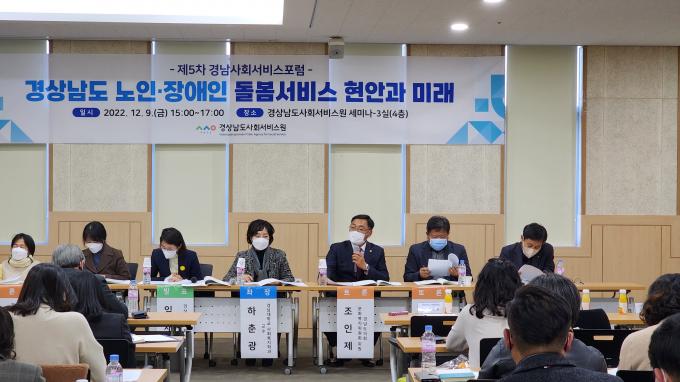 경남도사회서비스원은 9일 사회서비스정책 현안에 대한 지역사회 관심을 촉구하고 사회서비스 발전 방향을 모색하기 위해 '돌봄서비스 현안과 미래' 주제로 포럼을 열었다.