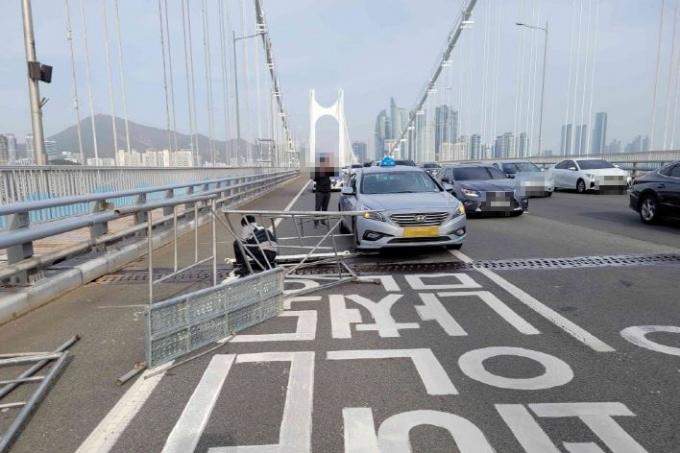 13일 해운대경찰서에 따르면 이날 오후 1시 42분께 광안대교 상판 남천동 방향 현수교에서 조명설치를 위한 구조물 일부가 강풍에 쓰러졌다. 이 구조물은 부산불꽃축제 행사를 주최하는 조직위에서 발주해 설치된 것이다.