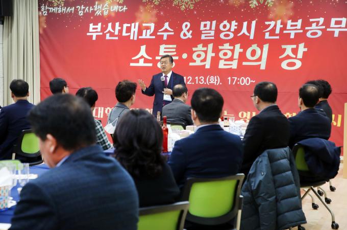 밀양시는 13일 도시재생지원센터(창작마당)에서 박일호 시장, 장성호 부산대학교 학장을 포함한 교수 등 50여 명이 참석한 가운데 양기관의 상생협력 발전을 위한 간담회를 개최했다.