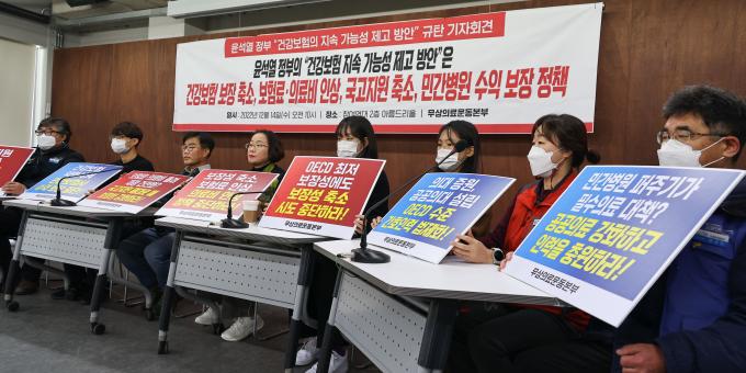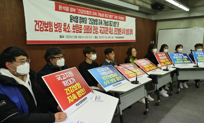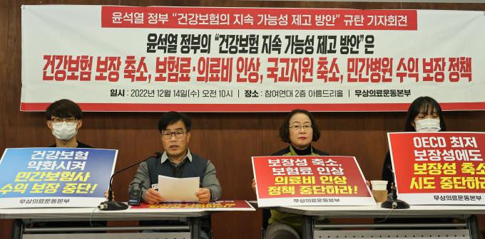 윤석열 정부의 '건강보험의 지속 가능성 제고 방안' 규탄 기자회견이 14일 오전 서울 종로구 참여연대 아름드리홀에서 열렸다. 무상의료운동본부가 주최한 이날 기자회견이다. 참석자들은 "정부가 추진하는 건강보험 정책은 보장성 축소와 보험료 및 환자 의료비 인상, 국고지원 축소, 민간병원 수익 보장 정책"이라고 비판했다.