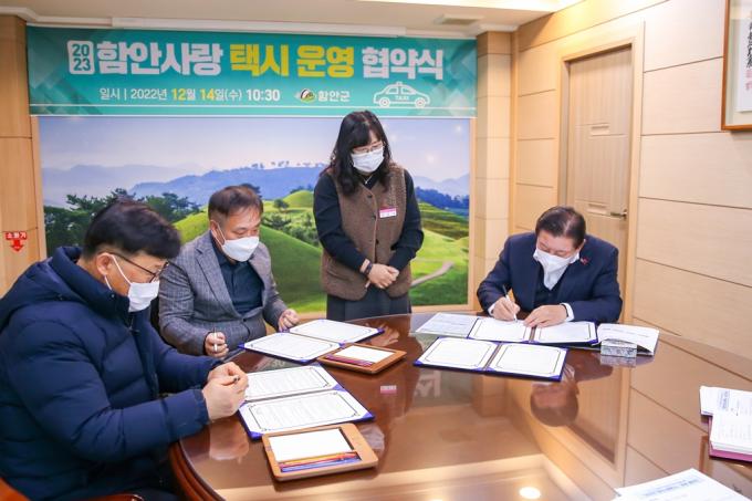 함안사랑택시의 원활한 운영을 위해 권역별 협약업체인 통일택시, 함안택시와 함께 사업운영과 지원, 안전과 이용자 권리보호 등의 내용으로 협약을 체결했다.