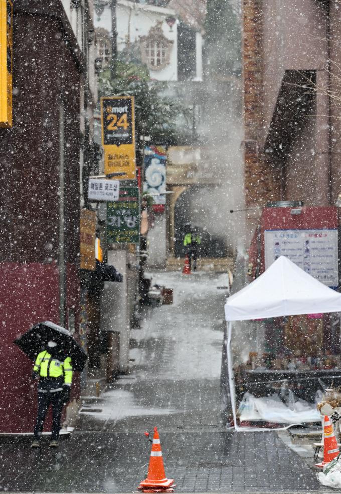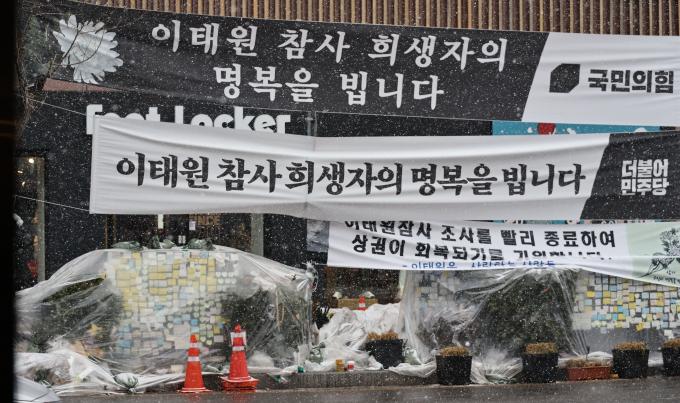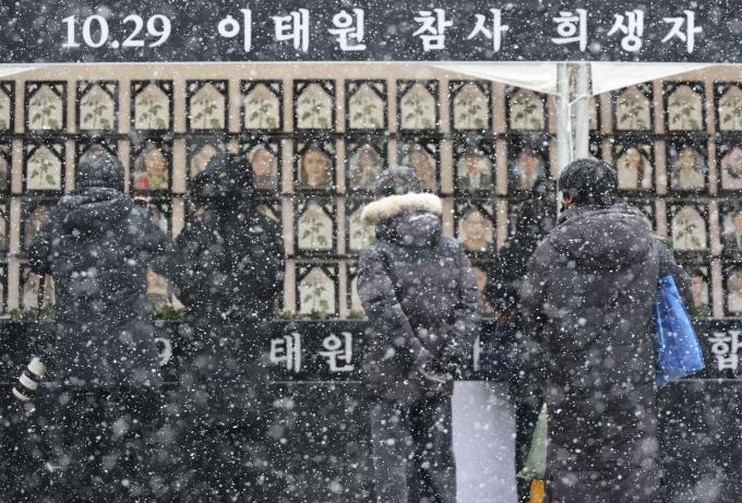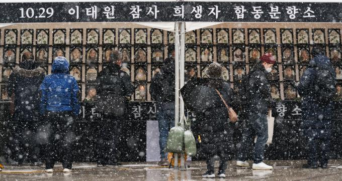 중부지방에 대설주의보가 내린 15일 오후 서울 용산 녹사평역 부근 이태원 참사 희생자 합동분향소를 찾은 시민들이 눈 속에서 조문을 하고 있다. 기상청은 늦은 오후쯤에는 눈이 그칠 것으로 예보했지만 기온이 떨어지는 퇴근길에는 길이 얼어붙어 미끄러우니 가급적 대중교통을 이용할 것을 당부했다.