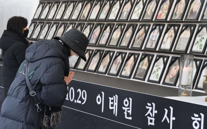 15일 오후 서울 용산 녹사평역 부근에 유가족들이 마련한 이태원 참사 희생자 합동분향소. 시민들이 강추위 속에서 희생자들을 추모하고 있다. 참사 후 처음으로 희생자 영정사진이 공개된 분향소다.