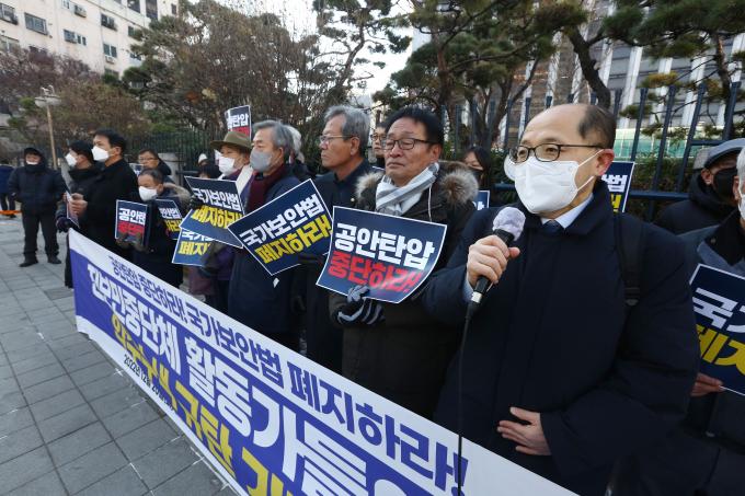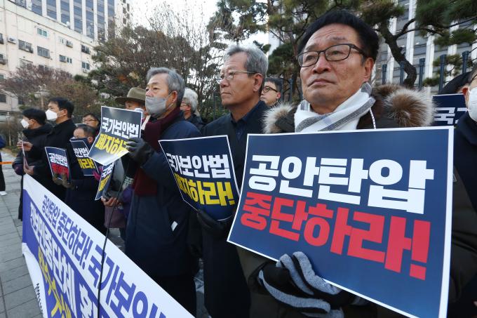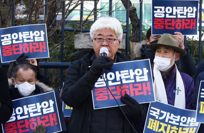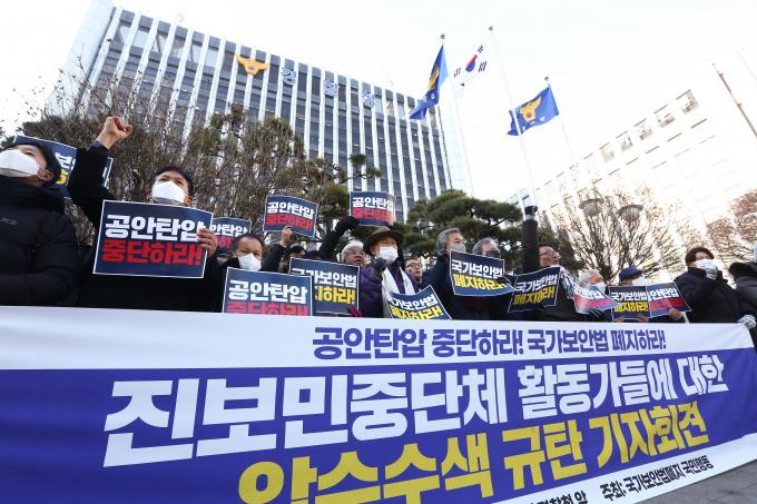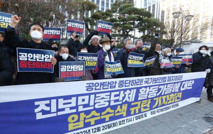 20일 서울 서대문구 경찰청 앞에서 국가보안법폐지 국민행동 주최로 진보민중단체 활동가들에 대한 압수수색 규탄 기자회견이 열렸다. 전국농민회총연맹 고창건 사무총장과 진보당 제주도당 박현우 위원장에 대해 공안당국이 19일 국가보안법 위반 혐의로 자택 압수수색 한 것에 대한 항의다.