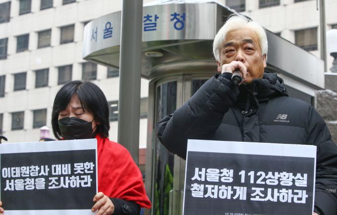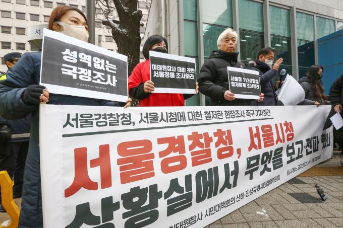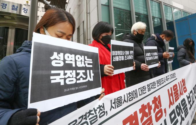 21일 서울 종로구 서울경찰청 앞에서 이태원 참사 희생자 유가족들이 기자회견을 열고 진상규명과 재발방지를 위한 국정조사특별위원회 위원들의 성역 없는 철저한 현장 조사를 촉구하고 있다.
