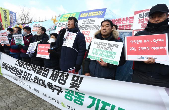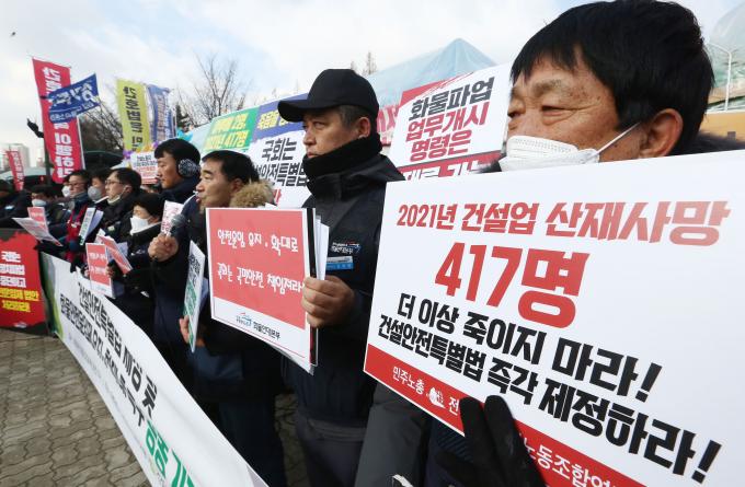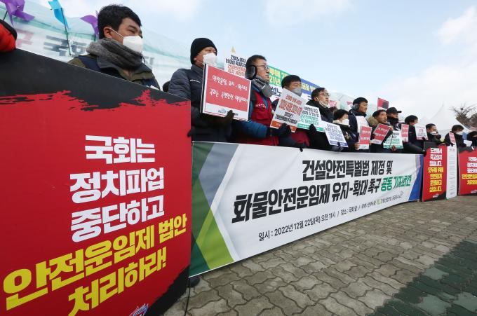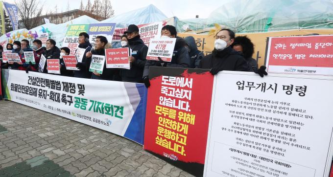 22일 오전 서울 여의도 국회 앞에서 열린 건설안전특별법 제정 및 화물 안전운임제 유지·확대 촉구 공동 기자회견에서 양경수(오른쪽 세 번째) 민주노총 위원장이 발언을 하고 있다. 기자회견에 참석한 장옥기 민주노총 건설산업연맹 위원장은 "2021년 한 해에만 건설업 현장에서 417명이 사고로 목숨을 잃었다"며 "더 이상 노동자를 죽이지 말고 건설안전특별법 즉각 제정하라"고 했다. 현정희 민주노총 공공운수노조 위원장도 국민을 위한 안전운행을 위해 화물 안전운임제 유지·확대는 꼭 필요하다며 국회에서 신속한 법안 통과를 촉구했다.