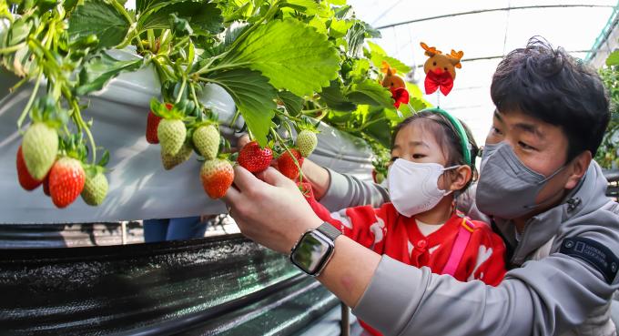 예년보다 16일이나 일찍 한강이 결빙되는 등 매서운 한파가 기승을 부리지만 온실 안에서는 딸기가 발갛게 익어간다. 지난 24일 주말을 맞아 경기도 고양시의 '꽃보다 딸기' 농장의 하우스를 찾은 가족들이 1000여평의 대규모 하우스에서 딸기를 따는 체험을 하며 잠시 추위를 잊고 있다.