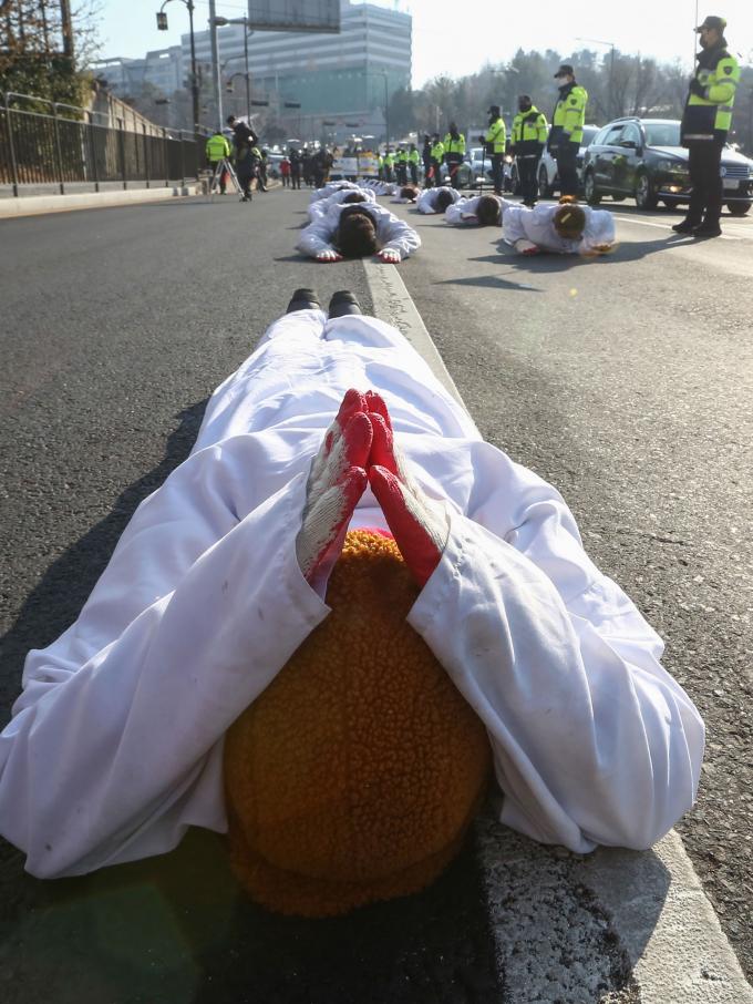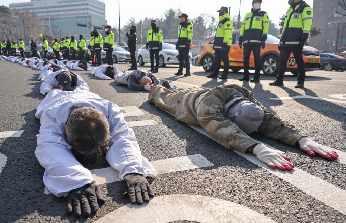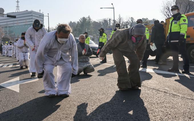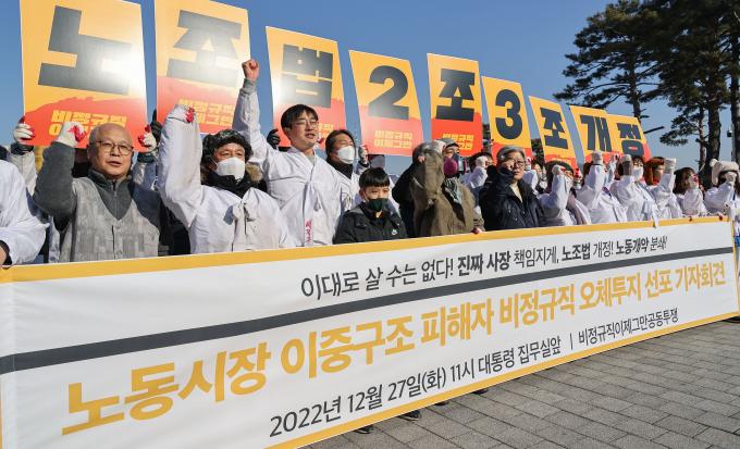 비정규직이제그만공동투쟁 활동가들이 27일 오전 서울 용산대통령 집무실부터 국회 앞까지 노동조합 및 노동관계조정법(노조법) 2·3조(노란봉투법) 개정을 촉구하는 '노동시장 이중구조 피해자 비정규직 오체투지'를 하고 있다.