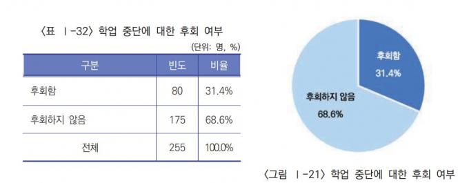 조사에 참여한 학교 밖 청소년의 68.6%는 '학교를 그만둔 것에 대해 후회하지 않는다'라고 답변했다. 이들은 학교를 그만둔 후 겪고 있는 어려움으로 '학교를 다니지 않는 것에 대한 사람들의 선입견·편견·무시'(32.5%)를 호소했다.