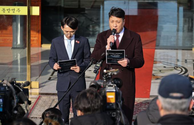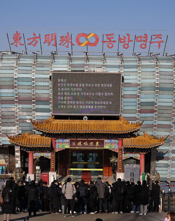 한국 내 중국의 비밀경찰서로 의심을 받고 있는 중국음식점 동방명주를 운영하고 있는 HG문화미디어 왕해군 대표가 29일 오후 잠실지구 한강시민공원 동방명주 식당 앞에서 기자회견을 열고 의혹을 부인하고 있다. 왕 대표는 한국에서 여러 가지 중국과 관련한 직책을 가진 본인이 비밀경찰서 의혹을 받는 것은 부당하다며 한국 언론에서 이런 의혹을 보도한다면 반드시 법적 책임을 물을 것이라고 경고했다. 식당 입구 대형 전광판에도 이런 경고문을 내보냈다.