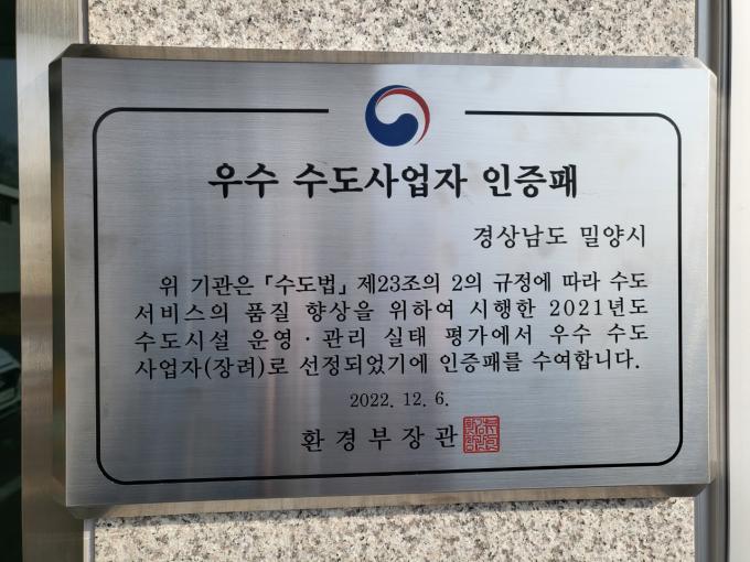 환경부는 급수인구 5만 명 이상 20만 명 미만의 평가그룹 41개 시·군 중 3위를 차지한 밀양시에 장려상을 수여하고 포상금 500만 원을 지급했다.