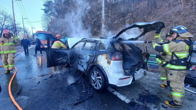 ▲31일 오전 울산 삼남읍의 한 도로에서 발생한 승용차 화재 현장 [울산소방본부 제공]