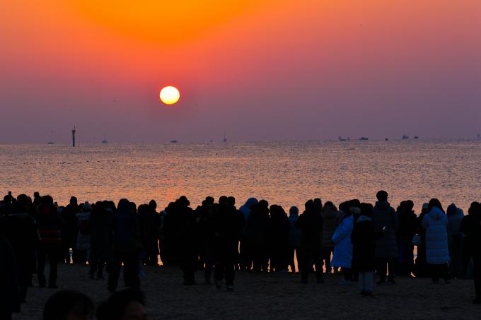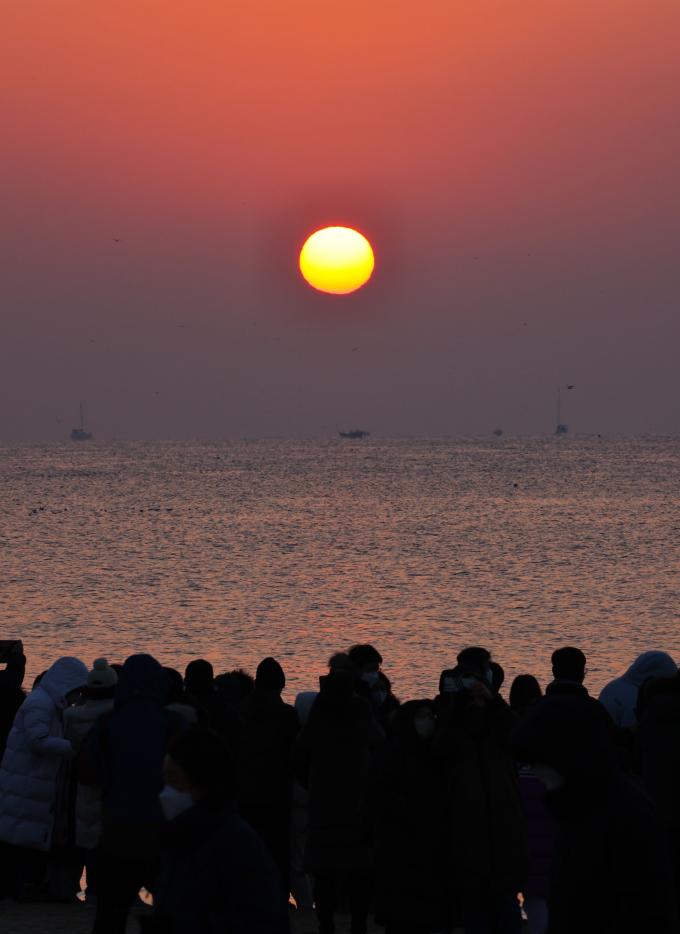 2023년 새해 첫 태양이 검은 바다 위로 솟아오르고 있다. 7시34분께 옅은 구름을 뚫고 붉은 기운이 솟구치자 수평선을 응시하던 이들은 환호하며 저마다 소원을 빈다. 2020년 이후 3년만의 해맞이 행사다. 이날 부산 해운대 해수욕장에는 약 5만여 인파가 몰려 새해 일출을 맞이했다.