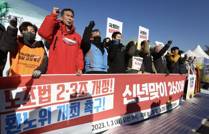 참가자들은 "해가 바뀌었지만 국회 환노위 고용노동법안소위원회는 노조법 2조와 3조 개정안에 대한 심의조차 마무리하지 않고 있다"며 "2023년 1월 9일이면 임시국회가 끝나는 상황임에도 구체적인 입법 로드맵도 밝히지 않는 무책임한 태도를 보이고 있다"고 정치권을 규탄했다.