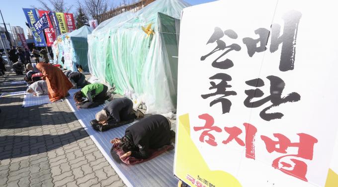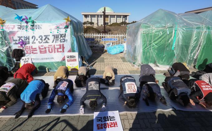 이들은 "여당인 국민의힘은 철저하게 법 개정을 가로막고 있으며, 다수당인 더불어민주당은 국민의힘과 대기업의 눈치를 보며 개정안 심의를 미루고 있다"며 국회 앞 인도에서 노조법 제정 이후 26년 간의 고통을 상기하기 위해 2600배를 했다.