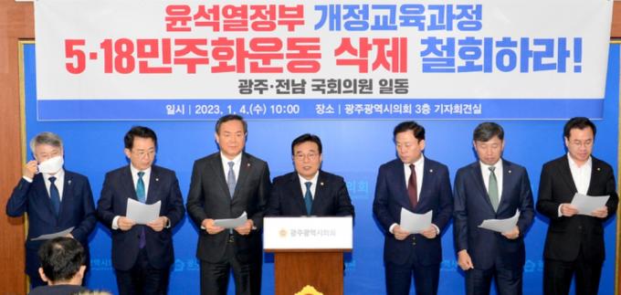 광주·전남 국회의원 20명은 4일 광주시의회에서 기자회견을 열고 "우리 아이들이 배우는 교육과정에서 5·18 민주화운동이 삭제된다면 민주주의 역사는 퇴색할 것이고 국민은 또다시 분열하게 될 것이라며 삭제 조치를 즉각 철회하라"고 촉구했다.