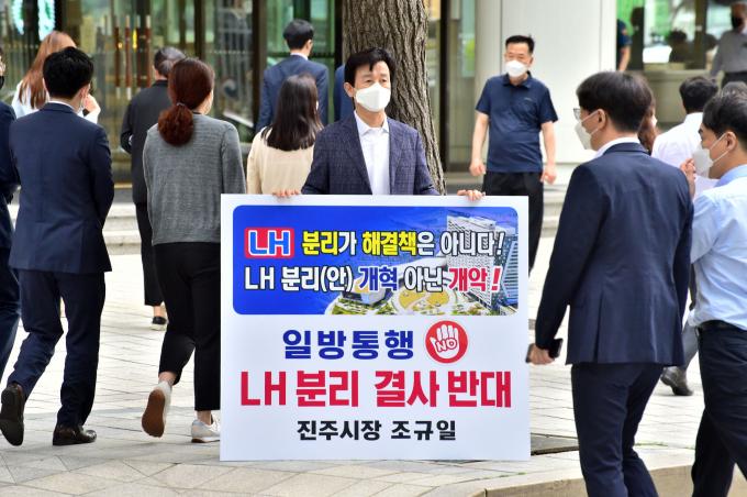이후 같은 해 6월 상공인과 시민단체로 구성된 경남진주혁신도시(LH) 지키기 범시민운동본부가 출범한 직후 조규일 시장은 정부청사, 청와대, 국회 앞에서 1인 시위를 벌이기도 했다.