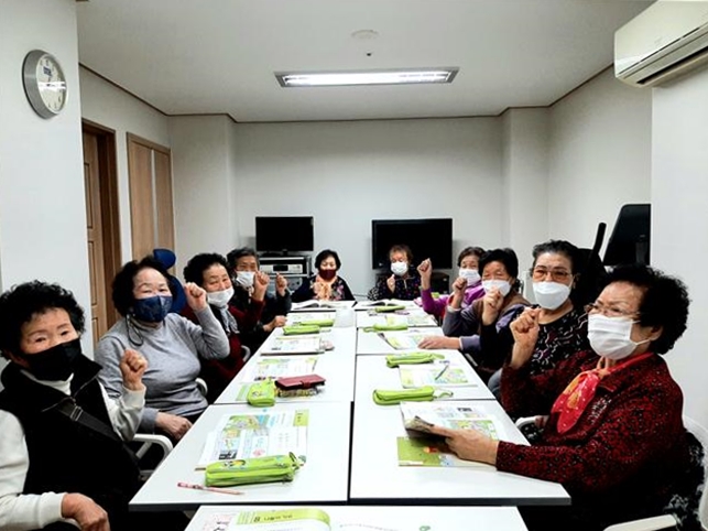 경로당 문해교실 수강 어르신은 "방바닥에서 공부할 때는 다리가 아파 힘들었는데 책걸상이 있으니 앉고 서기가 너무 편하다"고 반겼다.