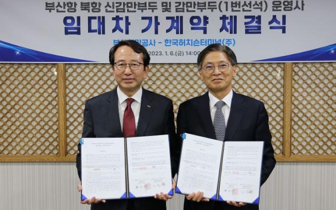 이날 체결식에는 강준석 BPA 사장과 정호수 허치슨 대표이사가 상호 합의된 임대차 가계약서에 기명 날인했다.