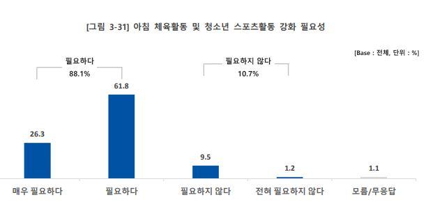 9일 부산시교육청에 따르면 지난해 12월 부산시민 1500명(학부모 476명 포함)을 대상으로 교육정책 정기 여론조사를 실시한 결과, 시교육청이 추진하고 있는 '아침 체육활동'에 대해 88.1%가 찬성했다.