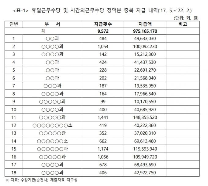 부당 지급된 시간외근무수당은 2017년 5월부터 2022년 2월까지 순천시청 18개 과로 모두 9572회 9억7500여만 원에 이른다.