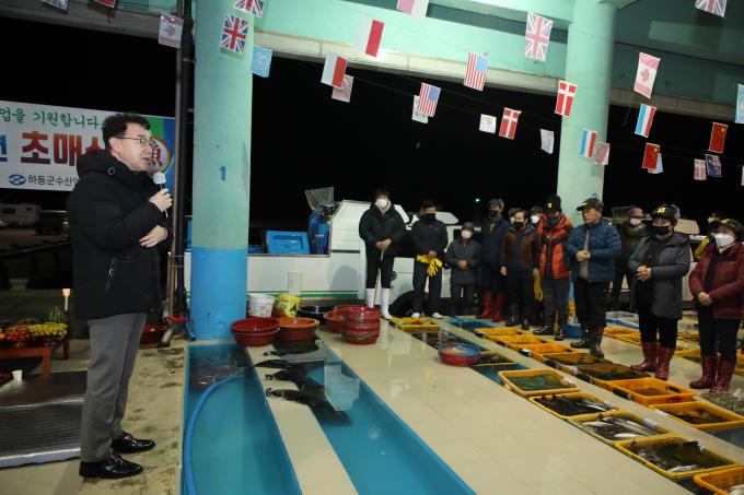하승철 군수와 손영길 수협장, 이하옥 군의회 의장, 김구연 도의원, 지역 군의원 등 100여 명이 참석한 가운데 한 해의 풍어를 바라는 기원제에 이어 감성돔·농어 등 이른 새벽 하동 연안에서 수확된 어획물 경매가 시작됐다.