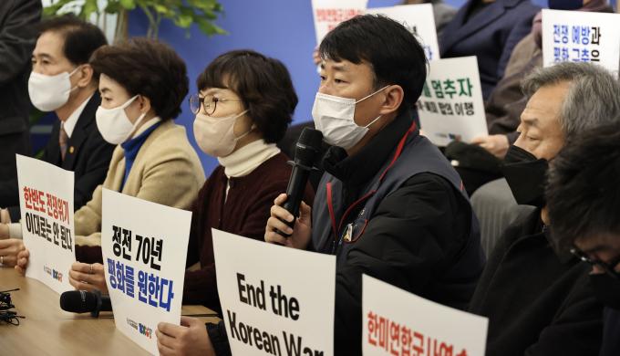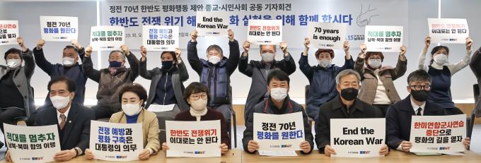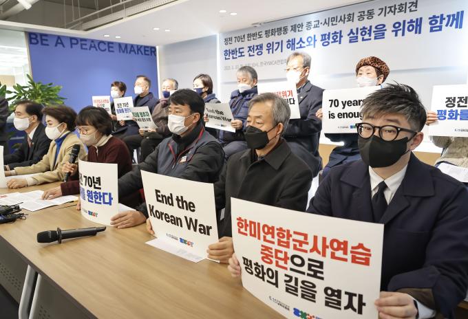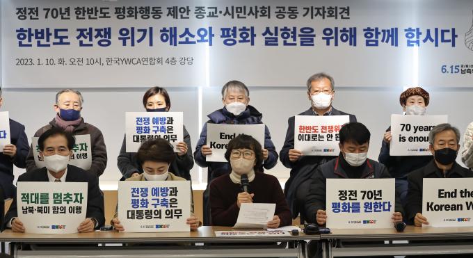 '한반도 전쟁 위기 해소와 평화 실현, 함께 합시다.' 10일 오전 '정전 70년 한반도 평화 행동 제안 종교·시민사회 공동 기자회견'이 6·15공동선언남측위원회 주최로 YWCA 강당에서 진행되고 있다.