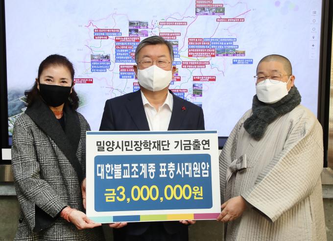 대한불교 조계종 표충사 대원암은 11일 밀양시청 방문해 지역우수인재양성 및 명문학교 육성지원을 위한 장학기금 300만 원을 기탁했다.
