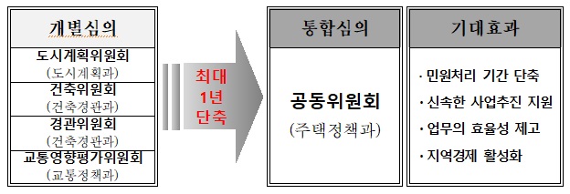 지금까지는 도시계획과에서 도시계획위원회를, 건축경관과에서 건축위원회와 경관위원회를, 교통정책과에서 교통영향평가위원회를 순차적으로 개별심의하면서 사업승인을 위해서는 최장 1년 이상의 시간이 소요됐다.