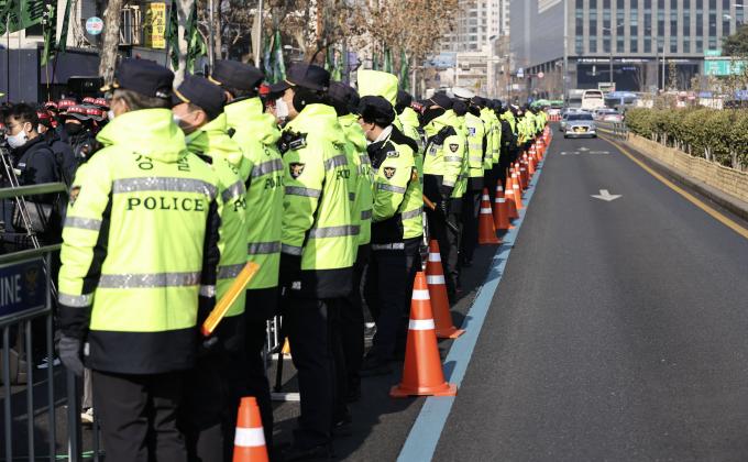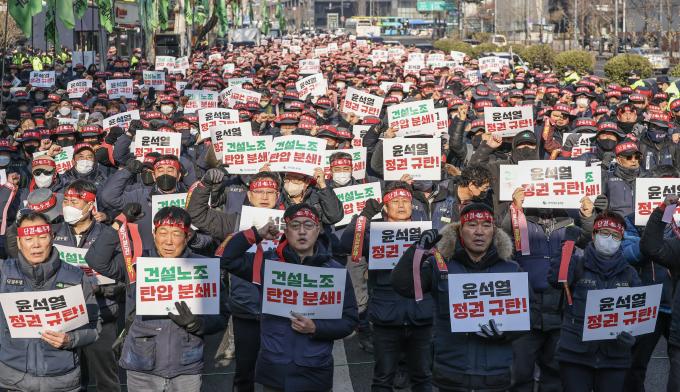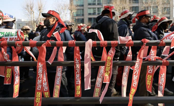 11일 오전 서울 서대문구 경찰청 앞 '건설노동자 생존권 사수, 노동 기본권 쟁취, 건설노조 탄압 규탄 건설노동자 총력투쟁 선포 수도권 사전 결의대회'에서 참석자들이 구호를 외치고 있다.
