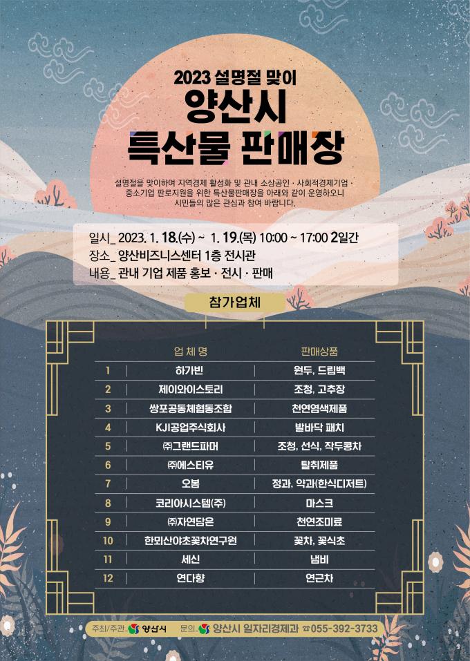 설맞이 특산물 판매장에는 12개 지역업체가 참여한다. 제품전시장 및 특별판매장을 열어 조청, 정과, 차류, 천연조미료 등의 식료품과 마스크, 탈취제품 등의 생활용품을 포함하여 다양한 제품을 판매한다.